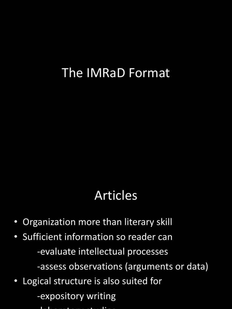The IMRaD Format | Thesis | Theory from imgv2-2-f.scribdassets.com In scientific writing, imrad or imrad (/ˈɪmræd/) (introduction, methods, results, and discussion) is a common organizational structure (a document format). Introduction, materials and methods, results, and discussion (short: Examples of these issues include sexual violence, harassment, the regulation of womenã¢â‚¬â„¢s bodies, and a multitude of others. Please fill this form, we will try to respond as soon as possible. Many journals expect scientific research papers to be written in the traditional format, which is also referred to as the imrad format (introduction, materials and methods, results, and discussion). Credits to the real owner of the document.full description. Raising to the base is a financial. It is made up of many unique concepts, events and methods.